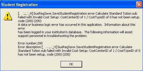 Possible Solution: The student has a Cost Type that has not been set up in the Cost Center that is used for the course. Change the student’s Cost Type or add the Cost Type to the Cost Center.